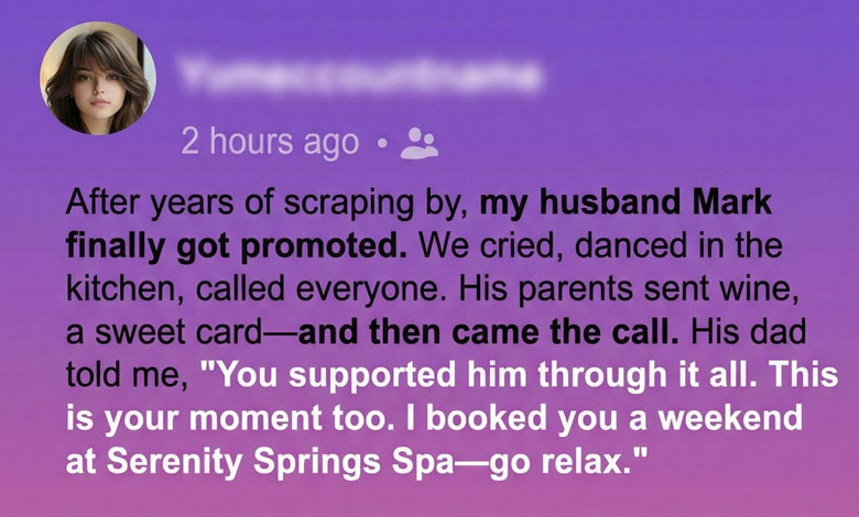When Mark finally got the promotion he had been working toward for years, it felt like our entire past had led to that moment. We had stretched every dollar, postponed vacations, and encouraged each other through late nights and early mornings. So when the call came, we celebrated in the kitchen like teenagers—laughing, spinning, and holding onto each other as if the walls themselves understood what it meant. His parents sent a thoughtful card and a bottle of wine. Then his father called and surprised me. “You stood by him through everything,” he said warmly. “This weekend is for you. I booked you a stay at Serenity Springs Spa.” It sounded generous, almost too generous, considering our history.