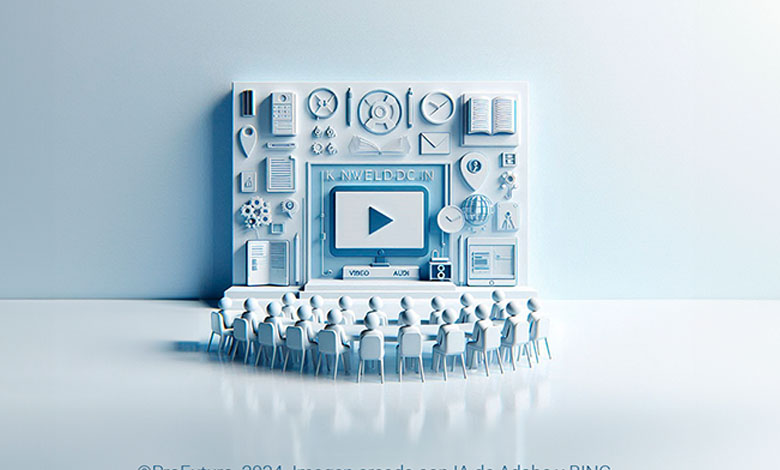 A person reading an informative article on a laptop while digital knowledge icons (books, search bar, graphs) appear around the screen.