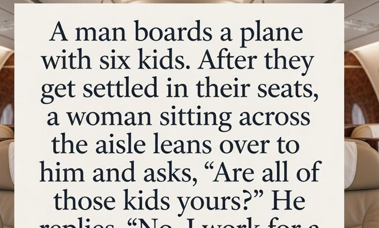 A man boards a plane with six kids, each holding onto him like they’re connected by invisible strings. A flight attendant asks, “Are they all yours?” He responds jokingly, “No, I work for a condom company. These are customer complaints!” The kids immediately start singing “Baby Shark,” causing chaos as they head to their seats. With kids causing minor havoc, the man laughs off the situation and mutters, “Maybe I should’ve just taken a car.” The kids’ antics make the flight a mix of fun and frustration, including one telling a lady about the airplane’s engines and another drawing a giraffe flying the plane.